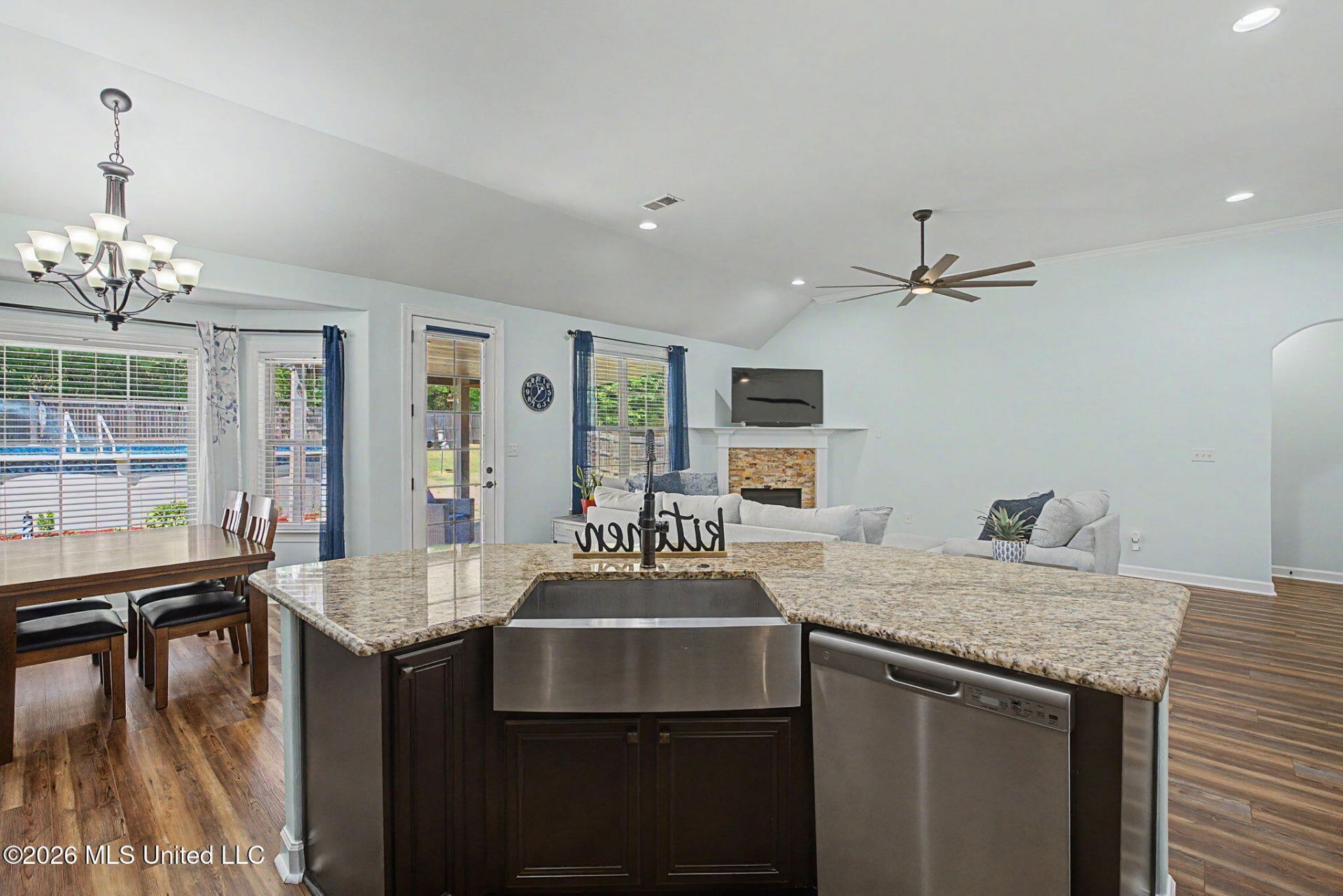 4253 Ridgemont Road, Olive Branch ? Single-level split-bedroom plan ? Covered patio, privacy-fenced backyard, and landscaped pool. ~~~~~ This 3 bedroom, 2 bath home delivers the kind of easy, everyday layout buyers are searching for, with beautiful curb appeal, high ceilings, and a large open-concept living, dining, and kitchen area that keeps everything connected. The kitchen features granite counters, staggered cabinets, stainless steel appliances, a refrigerator that remains, and a large island overlooking the great room. Luxury vinyl plank flooring runs through the common areas, while the great room adds a corner gas fireplace and backyard views toward the covered patio, pool area, and trees beyond the fence. ~~~~~ The spacious primary suite offers a walk-in closet, corner jetted tub, tiled walk-in shower, dual sinks, and granite counters. Two additional bedrooms are tucked on the opposite side of the home, and all bedrooms include walk-in closets for added storage. The hall bathroom features a tiled tub/shower combo and granite counters. ~~~~~ Outdoor living is where this home really stretches out, with a very large covered patio featuring a ceiling fan, a privacy-fenced backyard, landscaped pool with partial deck, sparkling blue water, and a small fire pit area for relaxing outside. ~~~~~ Improvements include a brand-new water heater and upgraded HVAC system. ~~~~~ Convenient Olive Branch location near medical facilities, restaurants, and I-22 for an easy commute to Memphis.